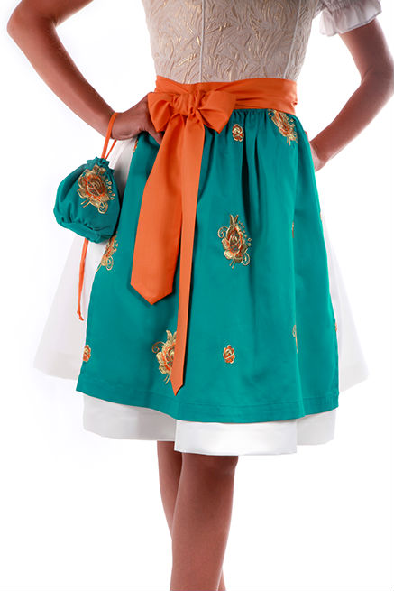 Türkis leuchtende Schürze mit aufgestickten Blüten in Gold und Orange. Der Gürtel dazu wurde in Orange gearbeitet.